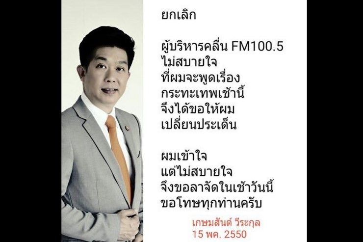 นายเกษมสันต์ วีระกุล ผู้ดำเนินรายการชื่อดัง ได้โพสต์ข้อความผ่านเฟซบุ๊กส่วนตัว Kasemsant Weerakun ระบุว่า "เช้านี้ไม่จัด FM 100.5 นะครับ ขอโทษด้วยครับ" พร้อมภาพที่มีข้อความว่า "ผู้บริหารคลื่น FM 100.5 ไม่สบายใจที่ผมจะพูดเรื่องกระทะเทพเช้านี้จึงได้ขอให้ผมเปลี่ยนประเด็น ผมเข้าใจ แต่ไม่สบายใจ จึงขอลาจัดในเช้าวันนี้ ขอโทษทุกท่านครับ"