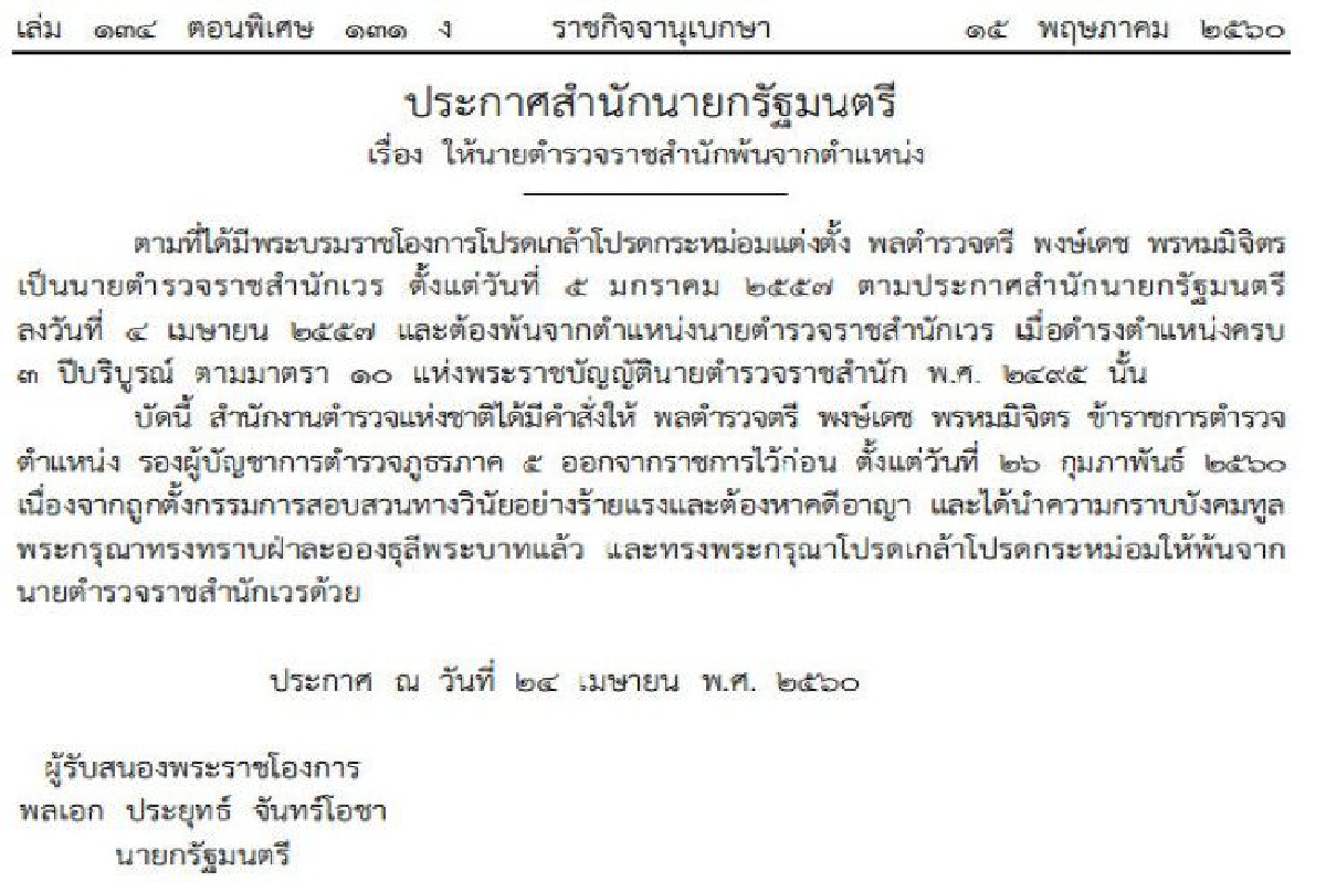 เมื่อวันที่ 15 พ.ค. ราชกิจจานุเบกษาเผยแพร่ ประกาศสํานักนายกรัฐมนตรีเรื่อง ให้นายตํารวจราชสํานักพ้นจากตําแหน่ง ระบุว่า ตามที่ได้มีพระบรมราชโองการโปรดเกล้าโปรดกระหม่อมแต่งตั้ง พลตํารวจตรี พงษ์เดช พรหมมิจิตร เป็นนายตํารวจราชสํานักเวร ตั้งแต่วันที่ 5 มกราคม 2557 ตามประกาศสํานักนายกรัฐมนตรี ลงวันที่ 4 เมษายน 2557 และต้องพ้นจากตําแหน่งนายตํารวจราชสํานักเวร เมื่อดํารงตําแหน่งครบ 3 ปีบริบูรณ์ ตามมาตรา 10 แห่งพระราชบัญญัตินายตํารวจราชสํานัก พ.ศ. 2495 นั้น