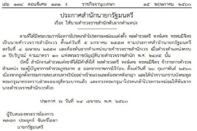 บัดนี้ สํานักงานตํารวจแห่งชาติได้มีคําสั่งให้ พลตํารวจตรี พงษ์เดช พรหมมิจิตร ข้าราชการตํารวจ ตําแหน่ง รองผู้บัญชาการตํารวจภูธรภาค 5 ออกจากราชการไว้ก่อน ตั้งแต่วันที่ 26 กุมภาพันธ์ 2560 เนื่องจากถูกตั้งกรรมการสอบสวนทางวินัยอย่างร้ายแรงและต้องหาคดีอาญา และได้นําความกราบบังคมทูลพระกรุณาทรงทราบฝ่าละอองธุลีพระบาทแล้ว และทรงพระกรุณาโปรดเกล้าโปรดกระหม่อมให้พ้นจากนายตํารวจราชสํานักเวรด้วย ประกาศ ณ วันที่ 24 เมษายน พ.ศ. 2560 ผู้รับสนองพระราชโองการ พลเอก ประยุทธ์ จันทร์โอชา นายกรัฐมนตรี