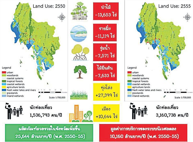 ผมเลยไปขอความช่วยเหลือจาก ดร.จตุพร เทียรมา จากมหาวิทยาลัยมหาสารคาม มาช่วยคำนวณการเปลี่ยนแปลงการใช้ที่ดิน และมูลค่าการให้บริการของระบบนิเวศ หรือคุณประโยชน์ที่ระบบนิเวศมอบให้กับเรา