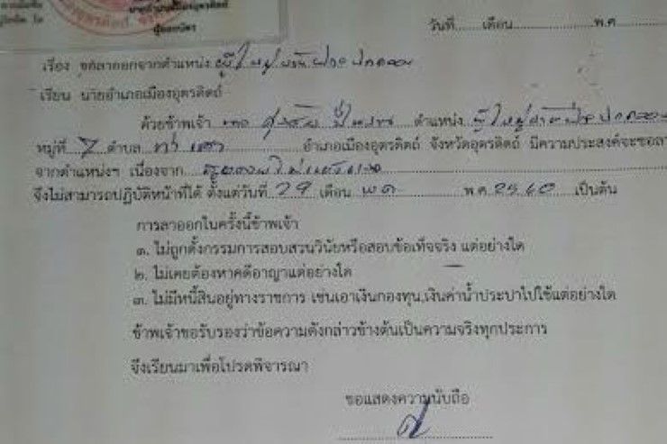 เมื่อวันที่ 29 พ.ค. นายศุรชัย ปิ่นปาน ผู้ใหญ่บ้านดงตะขบ หมู่ 7 ต.ท่าเสา อ.เมือง จ.อุตรดิตถ์ เข้ายื่นหนังสือลาออกจากตำแหน่งผู้ใหญ่บ้านฝ่ายปกครองต่อ นายประสงค์ อุไรวรณ์ นายอำเภอเมืองอุตรดิตถ์ โดยให้เหตุผลว่า สุขภาพไม่แข็งแรง และให้การลาออกมีผลทันที