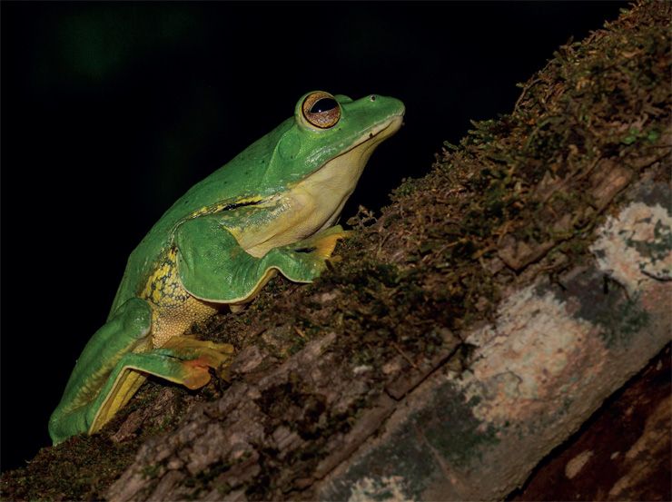 ผมเองไม่เคยเห็นกบอะไร ตัวจริงเสียงจริงมีสีเขียวเจิดจ้าน่าดูขนาดนี้มาก่อน “เทพด้วง” ขานชื่อมันออกมาว่า “ปาดเขียวตีนลาย” เป็นพวกปาดบินได้ ว่าแล้วก็กางพังผืดทั้ง 4 ตีนให้ดู อธิบายว่าพังผืดที่กว้างเป็นพิเศษ ช่วยให้มันร่อนลงจากยอดไม้สูงลงสู่พื้นได้นิ่มนวล เหมือนมีร่มชูชีพ 4 ผืนติดตัว อันหลังนี้ผมเติมเอง