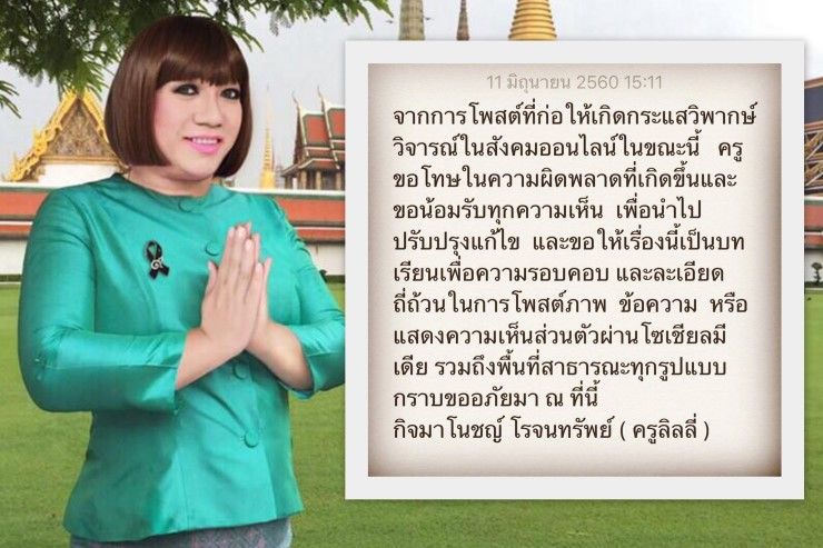 "จากการโพสต์ที่ก่อให้เกิดกระแสวิพากษ์วิจารณ์ในสังคมออนไลน์ในขณะนี้ ครูขอโทษในความผิดพลาดที่เกิดขึ้นและขอน้อมรับทุกความเห็น เพื่อนำไปปรับปรุงแก้ไข และขอให้เรื่องนี้เป็นบทเรียนเพื่อความรอบคอบ และละเอียดถี่ถ้วนในการโพสต์ภาพ ข้อความ หรือแสดงความเห็นส่วนตัวผ่านโซเชียลมีเดีย รวมถึงพื้นที่สาธารณะทุกรูปแบบ กราบขออภัยมา ณ ที่นี้"