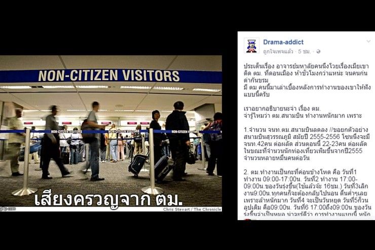 จากกรณีเฟซบุ๊ก piyabutr saengkanokkul ของ ผศ.ดร.ปิยบุตร แสงกนกกุล อาจารย์คณะนิติศาสตร์ มหาวิทยาลัยธรรมศาสตร์ โพสต์ข้อความตำหนิการรอคิวด่านตรวจคนเข้าเมืองโดยภรรยาของเขาต้องติดอยู่นานถึง 5 ชั่วโมง ที่ท่าอากาศยานดอนเมือง