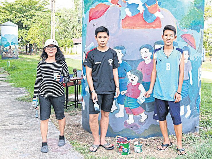 ภาพศิลปะที่ครูและนักเรียนชั้นมัธยมศึกษาปีที่ 5 โรงเรียนเมืองเชลียง อ.ศรีสัชนาลัย จ.สุโขทัย ช่วยกันบรรจงวาดภาพแล้วภาพเล่าลงบนแท็งก์เก็บน้ำฝน