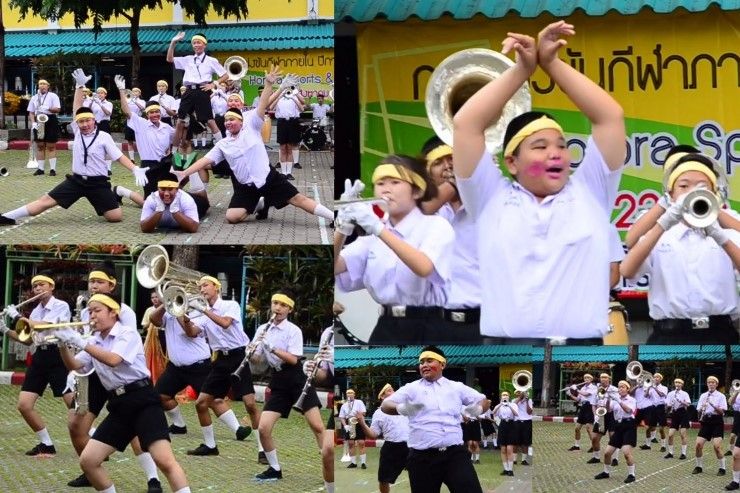 นักเรียนวงโยธวาทิตของโรงเรียนหอพระ โชว์ลีลาเป่าพร้อมเต้นประกอบจังหวะเพลงอย่างสนุกสนาน
