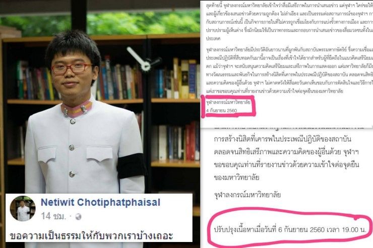 ล่าสุด นายเนติวิทย์ ได้โพสต์ข้อความผ่านเฟซบุ๊ก "Netiwit Chotiphatphaisal" โดยระบุว่า “ขอความเป็นธรรมให้กับพวกเราบ้างเถอะ” พร้อมกับแชร์ภาพข้อความที่อ้างว่า จุฬาฯ ได้มีการแก้ไขหนังสือเกี่ยวกับกรณีดังกล่าว พร้อมตั้งข้อสังเกตว่า แถลงการณ์ฉบับนี้ถูกการเมืองภายในเข้าแทรกแซงหรือไม่ เพราะสาระในการแก้ไข เป็นการตัดประโยคและแก้ไขประโยคที่กล่าวโทษ อาจารย์ที่ล็อกคอนิสิตให้ดูเบาลง รวมถึงมองว่า การที่จุฬาฯ ได้ตัดประโยคที่บอกว่า ไม่คาดหวังให้สื่อตะวันตกเห็นชอบกับการตัดสินใจและวิธีการที่จุฬาฯ ใช้ลงโทษนิสิตกลุ่มนี้ จนมีการพูดคุยกันในแวดวงวิชาการต่างประเทศ ว่าอาจกระทบต่อการจัดอันดับมหาวิทยาลัย จนอาจเป็นเหตุผลหลักทำให้จุฬาฯ ตัดประโยคปัญหานี้ออกไป