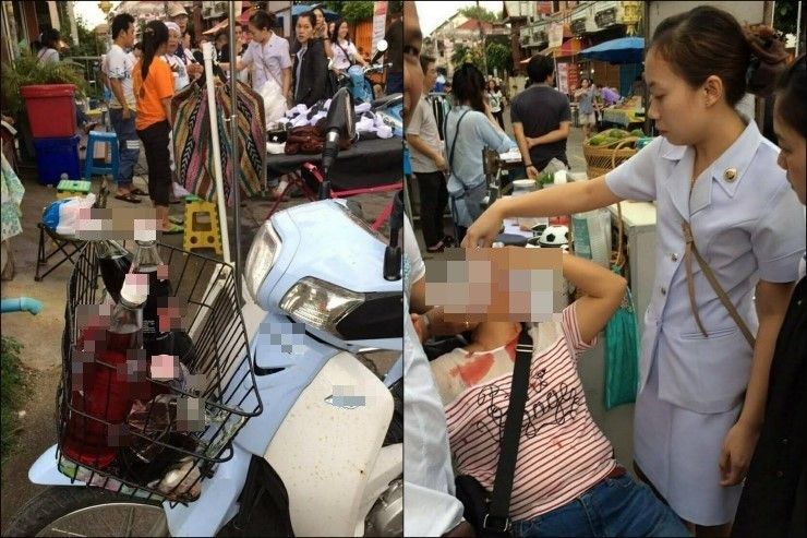 อุบัติเหตุสาวถูกขวดน้ำอัดลมที่วางอยู่บริเวณตะกร้าหน้ารถจักรยานยนต์ระเบิดใส่หน้า