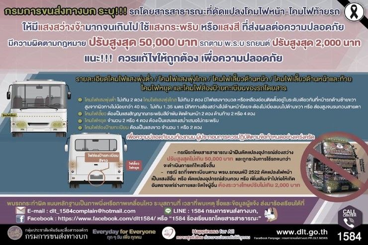 นายสนิท พรหมวงษ์ อธิบดีกรมการขนส่งทางบก เปิดเผยว่า กรมการขนส่งทางบกได้รับแจ้งจากประชาชนผู้ใช้รถใช้ถนนเกี่ยวกับกรณีที่ได้รับความเดือดร้อนรำคาญจากรถโดยสารไม่ประจำทาง รถบัสเช่าเหมา ที่ติดตั้งโคมไฟจำนวนหลายดวงบริเวณโดยรอบด้านหน้าและด้านท้ายของตัวรถ รวมถึงรถโดยสารสาธารณะประเภทอื่นๆ เช่น รถตู้โดยสาร ที่มีการปรับแต่งทิศทางการส่องสว่างของโคมไฟหน้ารถให้สูงขึ้นจากเดิม หรือดัดแปลงอุปกรณ์ส่วนควบหรือเพิ่มเติมส่วนหนึ่งส่วนใดเข้าไป จนทำให้แสงมีความสว่างจ้ามากจนเกินไป การดัดแปลงโคมไฟท้ายรถเป็นแสงกะพริบหรือใช้แสงสีต่างๆ ไม่เป็นไปตามที่กฎหมายกำหนด