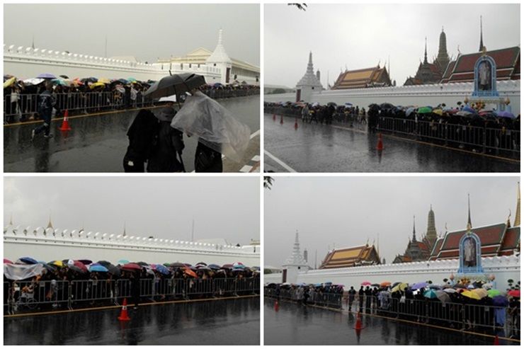 ประชาชนจำนวนมากนำพวงมาลัย ดอกไม้สดกราบสักการะพระบรมฉายาลักษณ์ในหลวงรัชกาลที่ 9 อย่างเนืองแน่น แม้ฝนตก