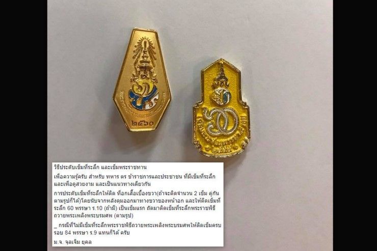 เมื่อวันที่ 25 ต.ค. พลตรี หม่อมเจ้าจุลเจิม ยุคล โพสต์เฟซบุ๊กส่วนตัวแนะนำวิธีการประดับเข็มพระราชทานและเข็มที่ระลึก สำหรับข้าราชการและประชาชนที่จะไปร่วมงานพระราชพิธีฯ โดยมีเนื้อหาว่า