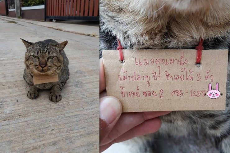 เมื่อวันที่ 8 ต.ค. ในกลุ่ม “ทาสแมว” ของผู้ชื่นชอบและรักแมวในสังคมออนไลน์มีการเผยแพร่ข้อความจากโพสต์ผู้ใช้เฟซบุ๊กชื่อ “Sunti Tiemwan” เป็นเรื่องราวที่เจ้าของโพสต์ไปเจอกับเจ้าเหมียวตัวหนึ่งกำลังนั่งอยู่หน้าบ้าน โดยที่คอมีป้ายข้อความเขียนว่า “แมวคุณมานั่งเฝ้าปลาทูป้า ป้าเลยให้ 3 ตัว ลงชื่อป้าเมย์ ซอย 2 พร้อมกับทิ้งหมายเลยเบอร์โทร.....ไว้”