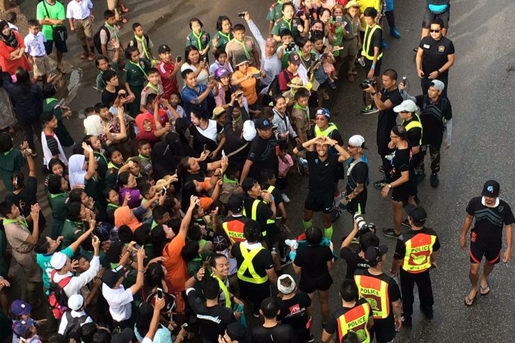 ตลอดเส้นทาง ตูน วิ่งยิ้มมีประชาชนส่งเสียงเชียร์พี่ตูนสู้ๆตลอด เมื่อพบเด็กนักเรียนที่ยืนต้อนรับรอมอบเงินได้วิ่งเข้าไปแตะมือและนำหมวกลูกเสือสำรองของนักเรียนมาสวมใส่ทำท่าตะเบ๊ะเคารพแถวนักเรียนที่ยืนอยู่เป็นที่สนุกสนานครึ้นเครงมาก และเมื่อพบผู้สูงอายุทุกคนที่นั่งรอบริจาคตูนได้ลงไปนั่งคุกเข่ายกมือไหว้และหันแกล้มให้ผู้สูงอายุหอมเป็นกำลังใจ บางช่วงมีรถบัสโดยสารแล่นสวนขบวนอีกฟากของถนน และมีผู้โดยสารจำนวนมากเปิดหน้าต่างรถตะโกนเรียกพี่ตูนสู้ๆ ตูนก็กระโดดตัวลอยยกมือทักทาย และยกมือหันไปทักทายประชาชนกลุ่มใหญ่ที่ยืนต้อนรับอยู่บนสะพานลอยเนื่องจากเข้าไม่ถึงตูน
