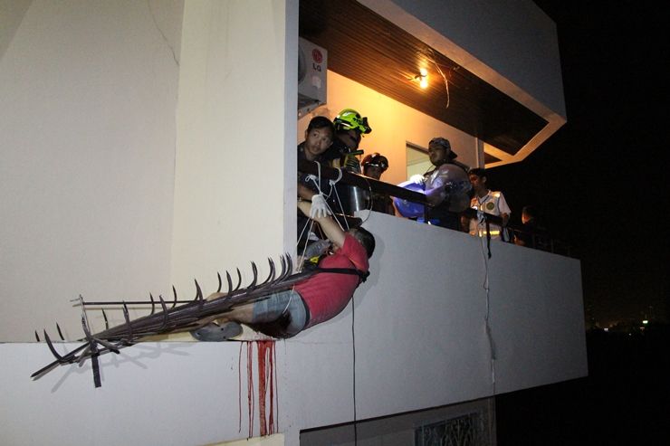 พัทยา-หนุ่มรัสเซียเข้าห้องพักไม่ได้ปีนด้านข้างอาคารพลาดตกร่างเสียบเหล็กห้อยต่องแต่งคาระเบียงชั้น4อาการสาหัส