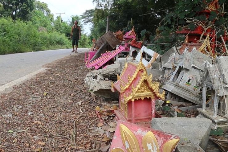 ผู้นำท้องถิ่นผวาอาถรรพ์ไม่กล้าเก็บซากศาลพระภูมิริมถนน