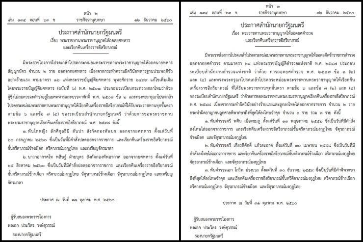ราชกิจจานุเบกษาเผยประกาศโปรดเกล้าฯถอดยศและเรียกคืนเครื่องราชฯตำรวจ-ทหารรวม5ราย กระทำผิดวินัย-ประพฤติชั่วอย่างร้ายแรง