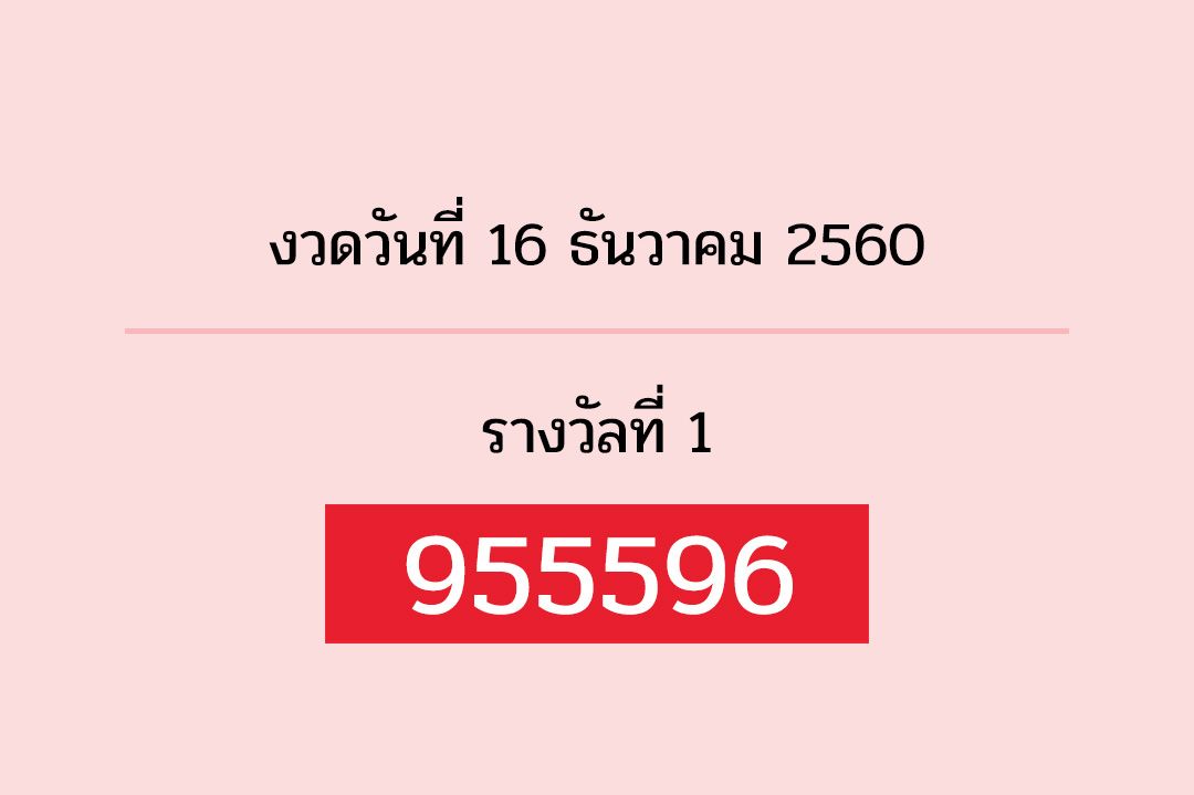 ตรวจผลสลากกินแบ่งรัฐบาลตรวจหวย16 ธันวาคม 2560รางวัลที่1คือ955596เลข3ตัวหน้า616,836ท้าย290,938ท้าย2ตัว89