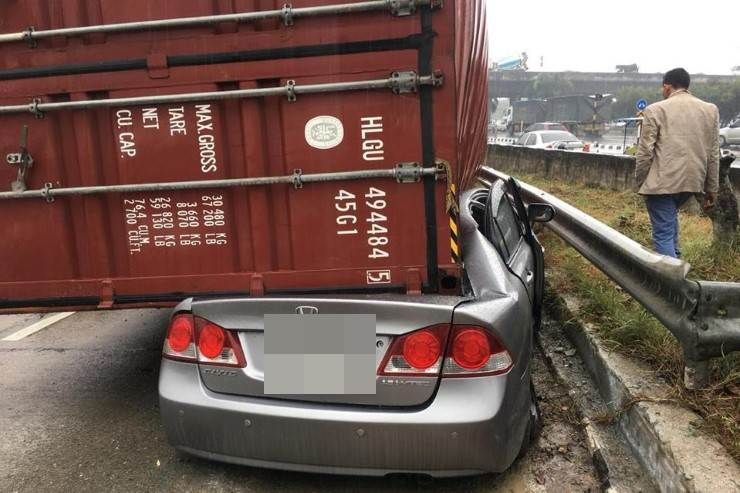 จากการสอบสวนเบื้องต้นทราบว่า รถบรรทุกตู้คอนเทนเนอร์ได้วิ่งมาตามเส้นทาง เมื่อมาถึงที่เกิดเหตุซึ่งเป็นทางโค้งได้เกิดเสียหลักจนตู้คอนเทนเนอร์หล่นลงมาทับรถเก๋งที่วิ่งมาได้รับความเสียหายและมีผู้บาดเจ็บ