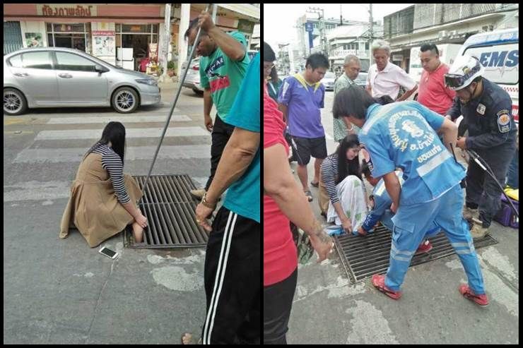 ซ่อมตะแกรงท่อระบายน้ำแล้ว! หลังสาวพลัดตกจนขาติด