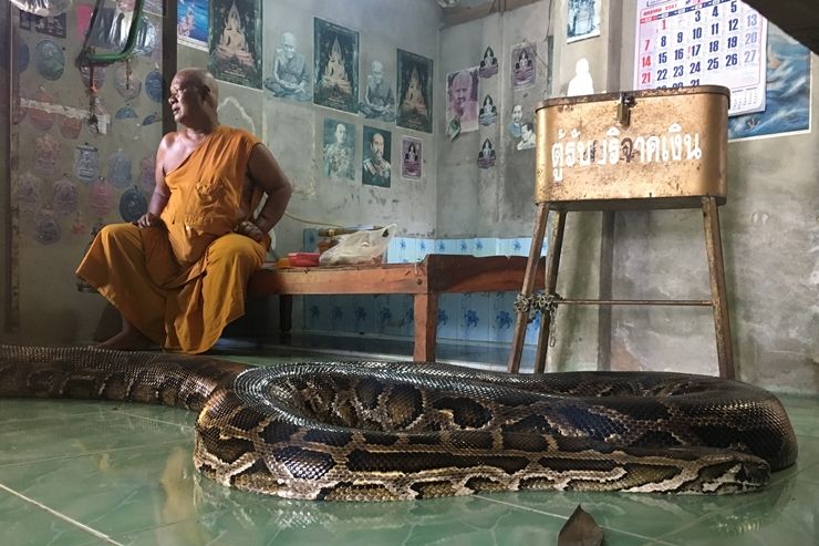 ที่วัดห้วยระย้า หมู่ 5 ต.นาพรุ อ.พระพรหม จ.นครศรีธรรมราช มีงูเหลือมยักษ์รักษาคนป่วย ซึ่งจะมีคนเดินทางมารักษากับงูเหลือมยักษ์ทุกวัน