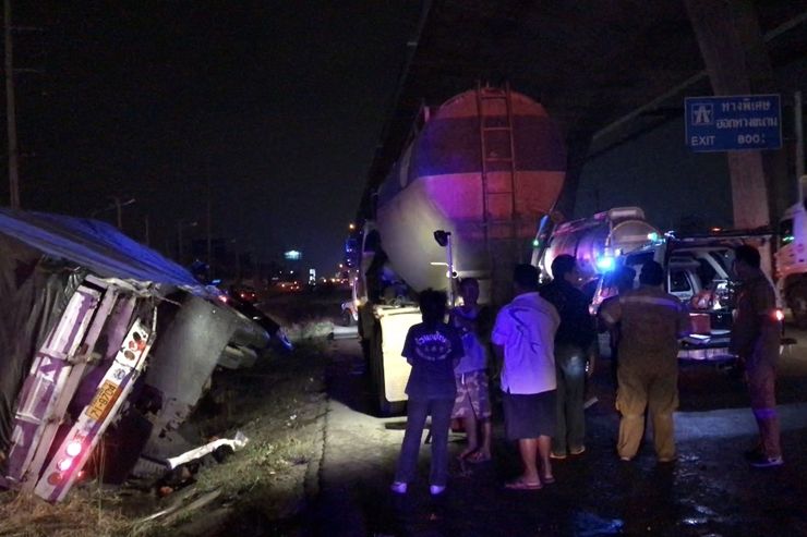 สมุทรปราการ-รถพ่วง 18 ล้ออ้างถูก6ล้อตัดหน้าหักหลบไปพุ่งชนท้ายรถ10ล้อที่ช่องทางด่วนถนนเทพรัตนคนขับกำลังผูกโซ่ดับ1สาหัส2