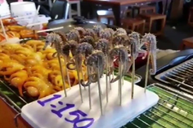 จากกรณีมีนักท่องเที่ยวที่เดินทางไปเที่ยว ตลาดน้ำสี่ภาคพัทยา จ.ชลบุรี พบว่ามีร้านขายอาหารพวกปลาหมึกย่าง อาหารทะเลย่างและมีการนำม้าน้ำมาย่างเสียบไม้ขาย ในราคาไม้ละ 150 บาท ซึ่งนักท่องเที่ยวให้ความสนใจและถ่ายรูปลงทางโลกโซเชียล จนเป็นข่าวฮือฮา ซึ่งเจ้าของร้านบอกว่าเป็นม้าน้ำย่างจริง กลุ่มที่นิยมบริโภคมักเป็นนักท่องเที่ยวชาวจีน