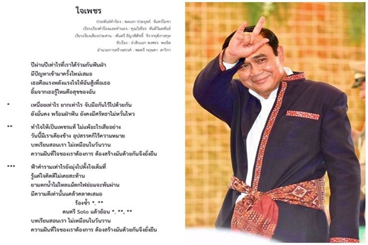 พล.อ.ประยุทธ์ จันทร์โอชา นายกรัฐมนตรี ได้มีการแต่งเพลงใหม่อีกครั้ง ชื่อ "ใจเพชร" เพื่อเป็นกำลังใจให้กับบุคคลที่เสียสละ สำหรับ เนื้อเพลงมีเนื้อหาโดยสรุป กล่าวถึงช่วงปีที่ผ่านมาฝ่าฟันอุปสรรคต่างๆ แต่เธอคือแรงพลังแรงใจให้ฉันสู้เพื่อเธอ ยังมั่นคงพร้อมฝ่าฟัน ทำใจให้เป็น เพชรแท้ ไม่แพ้อะไรเสียอย่าง ฟ้าคำรามเท่าไรยังมุ่งไปตั้งใจเต็มที่ ไม่เคยสะท้าน ยาม ตกน้ำไม่ไหลแม้ตกไฟย่อมจะพ้นผ่านมีความดีเท่านั้นแคล้วคลาดเสมอ