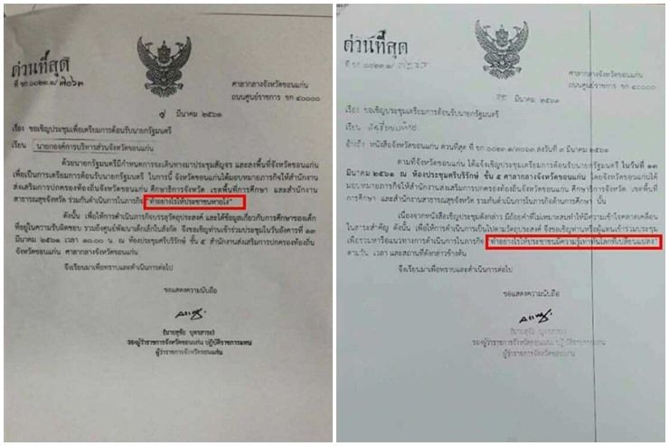 ต่อมาได้มีหนังสืออีกฉบับหนึ่ง ลงนามโดย นายสุชัย บุตรสาระ รองผู้ว่าราชการจังหวัดขอนแก่น ปฏิบัติราชการแทนผู้ว่าราชการจังหวัดขอนแก่น โดยเป็นหนังสือที่อ้างถึง หนังสือเลขที่ 0023.1/7063 ออกเมื่อวันที่ 12 มี.ค. 2561 เนื้อหาหนังสือฉบับนี้ระบุว่า ตามที่จังหวัดขอนแก่น ได้แจ้งเชิญประชุมเตรียมการต้อนรับนายกรัฐมนตรี ในวันที่ 13 มี.ค. 2561 ณ ห้องประชุมศรีบริรักษ์ ชั้น 5 ศาลากลางจังหวัดขอนแก่น โดยจังหวัดขอนแก่น ศึกษาธิการจังหวัด เขตพื้นที่การศึกษา และสำนักงานสาธารณสุข ร่วมกันดำเนินการในภาพกิจด้านการศึกษา นั้น