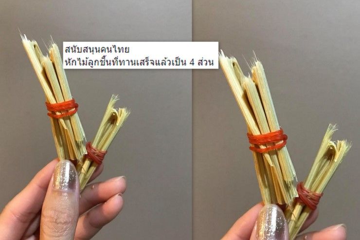 “สนับสนุนคนไทย หักไม้ลูกชิ้นที่ทานเสร็จแล้วเป็น 4 ส่วน มัดด้วยหนังยาง แล้วจับใส่ในถุงพลาสติก มัดถุงพลาสติกหรือรัดด้วยหนังยางอีกชั้นให้แน่น ก่อนทิ้งลงถังขยะอีกที