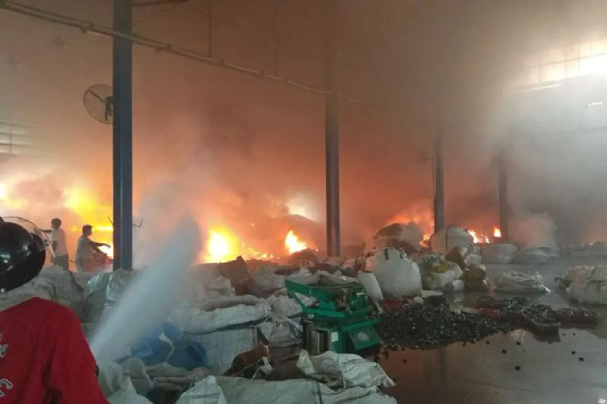 ฉะเชิงเทรา-เพลิงไหม้โกดังโรงงานรีไซเคิลขยะอิเล็กทรอนิกส์สาเหตุกล่องควบคุมวงจรไฟฟ้าอยู่ใกล้กับเตาเผาจนเกิดระเบิดเสียหายกว่า5ล้านบาท
