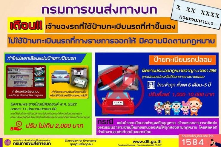 ขณะที่ วิธีการสังเกตแผ่นป้ายทะเบียนที่ออกให้โดยกรมการขนส่งทางบกอย่างถูกต้องตามกฎหมาย แผ่นป้ายต้องมีตัวย่อนูน ขส ที่มุมด้านล่างขวา มีลายน้ำตราเครื่องหมายราชการกรมการขนส่งทางบก (รูปมาตุลีเทพบุตรขับรถเทียมม้า) ปรากฏในแผ่นป้ายทะเบียนรถ ทั้งนี้ หากพบข้อสงสัยขอให้สอบถามมายังกรมการขนส่งทางบกได้โดยตรงที่ Call Center 1584 ตลอด 24 ชั่วโมง
