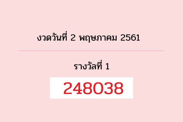 ตรวจผลรางวัลสลากกินแบ่งรัฐบาลงวดวันที่ 2พ.ค.61 รางวัลที่1คือ248038 เลขหน้า3ตัว 980 527 เลขท้าย3ตัว 225 602 เลขท้าย 2 ตัว 85