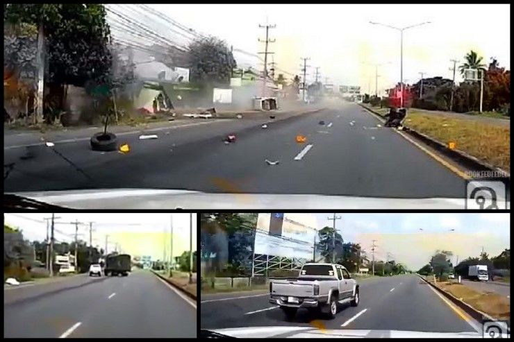 เพจเฟซบุ๊ก ร้อน ร้อน โพสต์คลิปวิดีโอจากกล้องหน้ารถยนต์ เผยให้เห็นการขับแซงซ้ายด้วยความเร็วของกระบะคันหนึ่ง ก่อนจะปะทะเข้ากับรถบรรทุกที่กำลังตีวงเลี้ยวเข้าซอยทางด้านซ้ายมือโดยไม่เปิดไฟเลี้ยว จนกลายเป็นอุบัติเหตุ