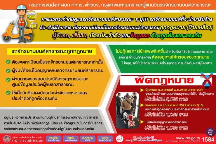 รองอธิบดีกรมการขนส่งทางบก กล่าวเพิ่มเติมว่า กรมการขนส่งทางบกขอความร่วมมือประชาชนเลือกใช้บริการรถจักรยานยนต์สาธารณะที่ถูกต้องตามกฎหมาย เพื่อความปลอดภัยในการใช้บริการและได้รับการคุ้มครองสิทธิประโยชน์ตามกฎหมาย ได้รับการคุ้มครองสิทธิประโยชน์ตามกฎหมาย ซึ่งกรมการขนส่งทางบกมีมาตรการเข้มงวดกวดขันการให้บริการรถจักรยานยนต์สาธารณะในระบบที่จดทะเบียนถูกต้อง หากให้บริการไม่เป็นธรรม เอาเปรียบผู้โดยสาร เรียกเก็บอัตราค่าโดยสารเกินอัตราที่ทางราชการกำหนด ลงโทษหนักสูงสุดทุกกรณี ผิดซ้ำซากพักใช้-เพิกถอนใบอนุญาตขับรถ ทั้งนี้ หากพบเห็นการนำรถจักรยานยนต์ส่วนบุคคลมารับจ้าง การเรียกเก็บค่าโดยสารเกิน หรือพบเห็นการกระทำความผิดอื่นๆ สามารถแจ้งเบาะแสได้ที่ศูนย์คุ้มครองผู้โดยสารและรับเรื่องเรียน สายด่วน 1584 ตลอด 24 ชั่วโมง