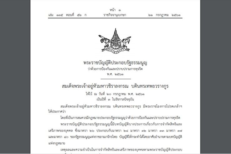 เว็บไซต์ราชกิจจานุเบกษา เผยแพร่ พระราชบัญญัติประกอบรัฐธรรมนูญ ว่าด้วยการป้องกันและปราบปรามการทุจริต พ.ศ. 2561 สมเด็จพระเจ้าอยู่หัวมหาวชิราลงกรณ บดินทรเทพยวรางกูร มีพระราชโองการโปรดเกล้าฯ ให้ประกาศว่า โดยที่เป็นการสมควรมีกฎหมายประกอบรัฐธรรมนูญว่าด้วยการป้องกันและปราบปรามการทุจริตพระราชบัญญัติประกอบรัฐธรรมนูญนี้มีบทบัญญัติบางประการเกี่ยวกับการจํากัดสิทธิและเสรีภาพของบุคคล ซึ่งมาตรา 26 ประกอบกับมาตรา 28 มาตรา 32 มาตรา 33 มาตรา 37 และมาตรา 40 ของรัฐธรรมนูญแห่งราชอาณาจักรไทย บัญญัติให้กระทําได้โดยอาศัยอํานาจตามบทบัญญัติแห่งกฎหมาย