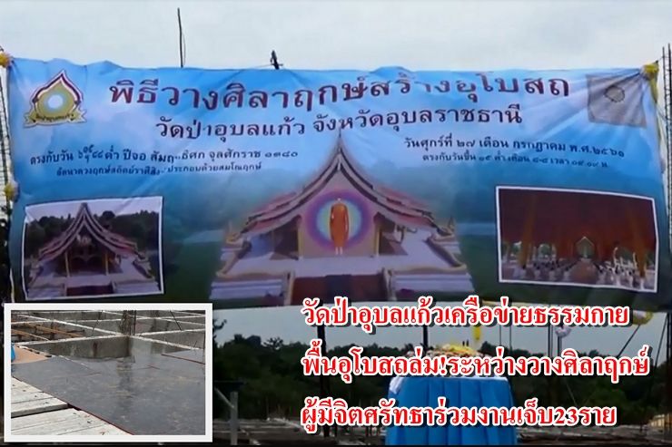 อุบลราชธานี-พื้นอุโบสถวัดป่าอุบลแก้วถล่มขณะประกอบพิธีวางศิลาฤกษ์เพื่อเตรียมการก่อสร้าง ผู้มีจิตศรัทธาร่วมงานตกจากที่สูง7เมตรเจ็บ23รายไม่มีผู้เสียชีวิต