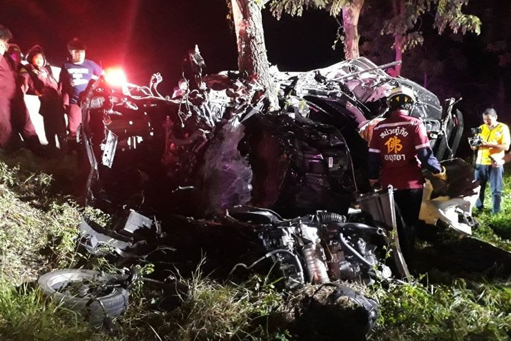 พระนครศรีอยุธยา-หนุ่มเชียงใหม่ซิ่งเก๋งข้ามทางรถไฟเสียหลักชนแท่งปูนทะลุร่องกลางประสานงาต้นไม้ใหญ่รถพังร่างแหลกเสียชีวิตหญิงนั่งมาด้วยสาหัสพื้นที่เกิดอุบัติเหตุถือเป็น1ใน5จุดอันตรายที่สุดในกรุงเก่า