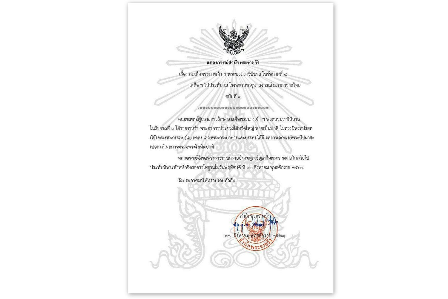 เมื่อวันที่ 30 สิงหาคม 2561เวลา 14.02 น. สำนักพระราชวังออกแถลงการณ์ เรื่อง สมเด็จพระนางเจ้า ฯ พระบรมราชินีนาถ ในรัชกาลที่ 9 เสด็จ ฯ ไปประทับ ณ โรงพยาบาลจุฬาลงกรณ์ สภากาชาดไทย ฉบับที่ 3 ระบุว่า คณะแพทย์ผู้ถวายการรักษาสมเด็จพระนางเจ้า ฯ พระบรมราชินีนาถ ในรัชกาลที่ 9 ได้รายงานว่า พระอาการประชวรไข้หวัดใหญ่ หายเป็นปกติ ไม่ทรงมีพระปรอท (ไข้) ทรงพระกรรสะ (ไอ) ลดลง เสวยพระกระยาหารและบรรทมได้ดี ผลการเอกซเรย์พระบัปผาสะ (ปอด) ดี ผลการตรวจพระโลหิตปกติ