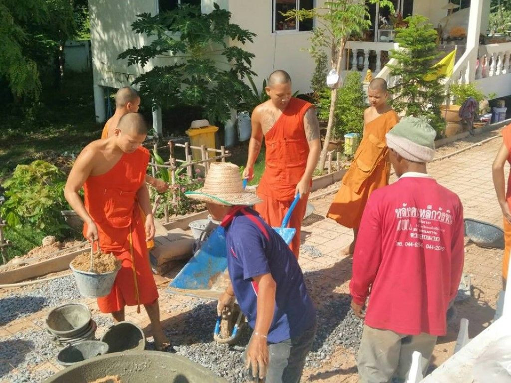 ชื่นชมพระเณรในอำเภอพิมายร่วมแรงร่วมใจกับชาวบ้านผสมปูนเทพื้นวัด