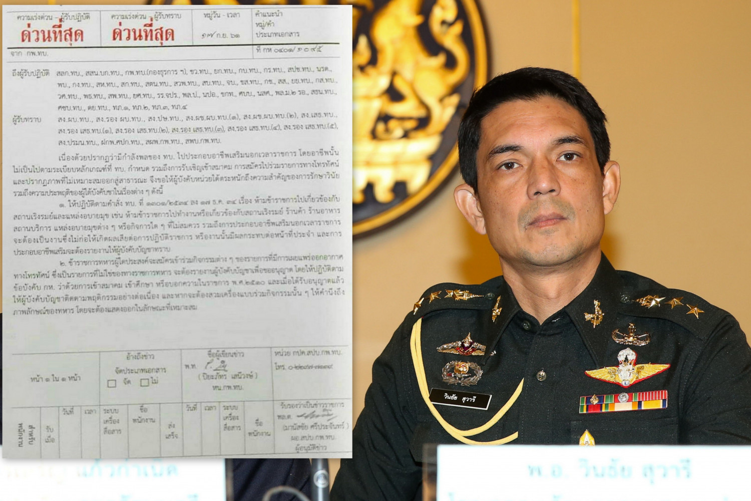 เมื่อวันที่ 19 ก.ย. พ.อ.วินธัย สุวารี โฆษกกองทัพบก ชี้แจงกรณีสังคมออนไลน์เผยแพร่หนังสือจากกองทัพบก ที่สั่งให้ผู้บังคับบัญชา ดูแลกำลังพลให้ปฏิบัติตามระเบียบหากจะไปออกรายการโทรทัศน์ ว่า เอกสารนั้นเป็นงานด้านการดูแลกำลังพลของ ทบ.เพื่อเน้นย้ำให้การดูแลกำลังพลของแต่ละหน่วย เป็นไปตามระเบียบและหลักเกณฑ์ที่มีอยู่