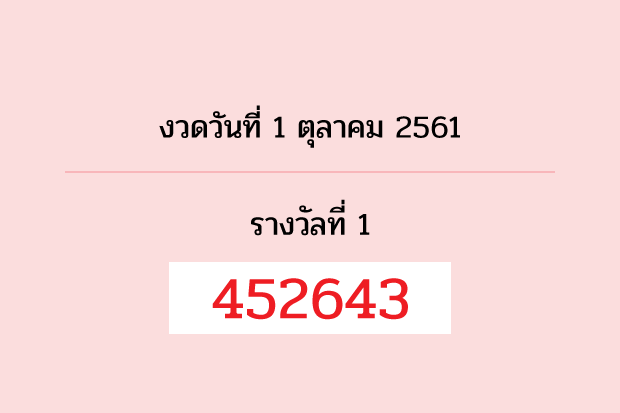 ผลสลากกินแบ่งรัฐบาลงวด 1 ต.ค.2561 รางวัลที่1คือ 452643 เลข 3 ตัวหน้า 726, 594 หลัง 810, 561 / 2ตัว 99