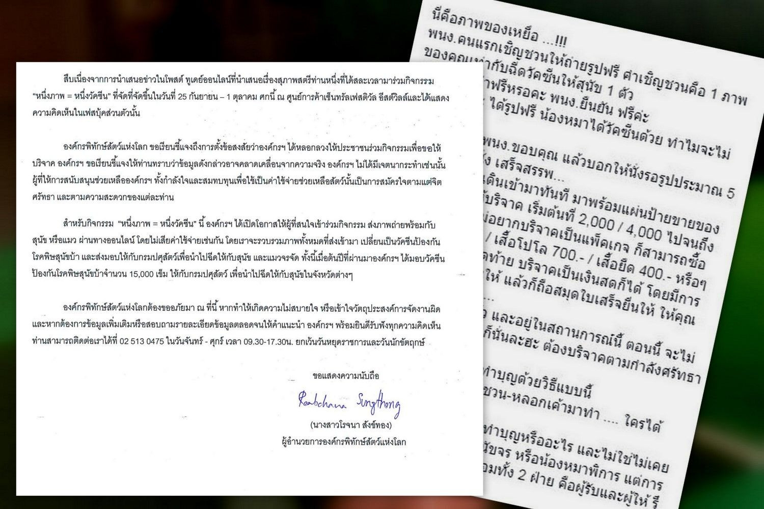 ล่าสุด เมื่อวันที่ 2 ต.ค. น.ส.วโรจนา สังข์ทอง ผู้อำนวยการองค์กรพิทักษ์สัตว์แห่งโลก ได้ชี้แจงว่า สืบเนื่องจากที่มีการนำเสนอเรื่องสุภาพสตรีท่านหนึ่งที่ได้สละเวลามาร่วมกิจกรรม "หนึ่งภาพ=หนึ่งวัคซีน" ที่จัดขึ้นในวันที่ 25 ก.ย.-1ต.ค. ณ ศูนย์การค้าเซ็นทรัลเฟสติวัล อีสต์วิลล์และได้แสดงความเห้นในเฟซบุ๊กส่วนตัวนั้น