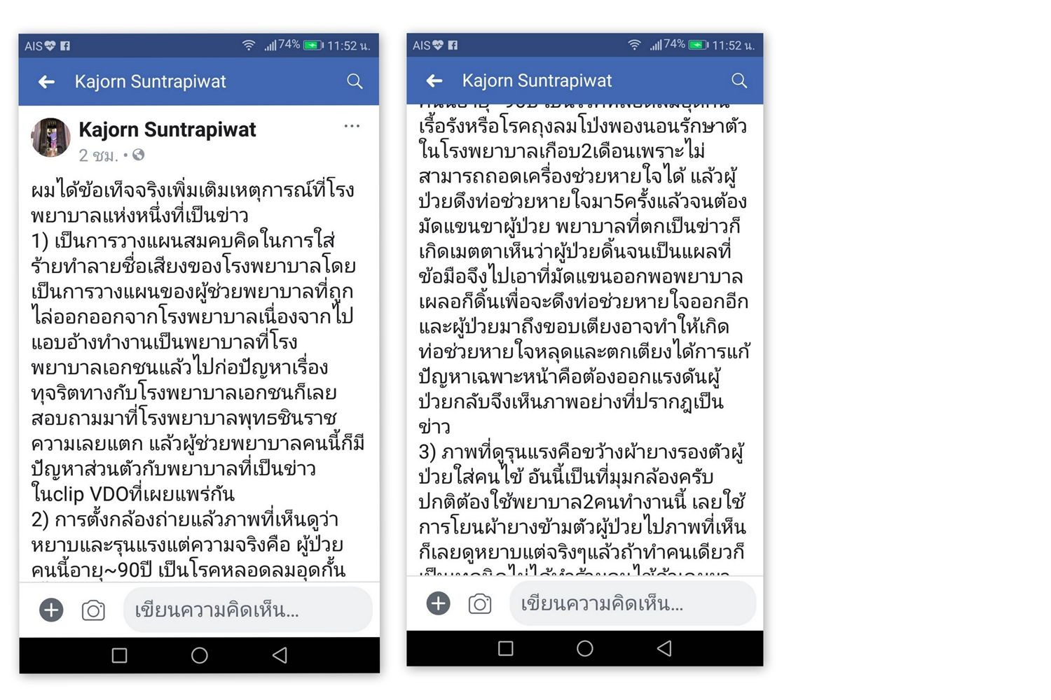 นายขจร สุนทราภิวัฒน์ หัวหน้ากลุ่มงานผู้ป่วยนอก โรงพยาบาลพุทธชินราช จังหวัดพิษณุโลก ได้โพสต์ข้อความลงในเฟซบุ๊กKajorn Suntrapiwatระบุว่า คลิปพยาบาลกระชากผู้ป่วยเป็นแผนใส่ร้ายของอดีตผู้ช่วยพยาบาลที่ถูกไล่ออกไปแล้ว เป็นการวางแผนสมคบคิดในการใส่ร้าย ทำลายชื่อเสียงของโรงพยาบาล และผู้ช่วยพยาบาลคนนี้ ก็มีปัญหาส่วนตัวกับพยาบาลที่เป็นข่าวในคลิปที่มีการเผยแพร่ ส่วนภาพที่ดูรุนแรง ก็เป็นที่มุมกล้อง เพราะปกติต้องใช้พยาบาล 2 คนทำงานนี้เลยใช้การโยนผ้ายางข้ามตัวผู้ป่วยถ้าทำคนเดียวก็เป็นเทคนิค ไม่ได้ทำร้ายคนไข้ และส่วนตัวรู้จักกับพยาบาลคนนี้มานาน ทำงานดี จริงจังกับงาน ไม่ได้มีความก้าวร้าวอะไร ถ้าไม่อึด ทึก ทน ก็ไม่สามารถอยู่ในหอผู้ป่วยอายุรกรรมเป็นเวลาเกือบ 15 ปีได้และยังเห็นใจพยาบาลคนนี้ที่ตกเป็นเหยื่อโซเชียลที่ตัดสินถูกผิดไปโดยขาดวิจารณญาณและข้อเท็จจริง