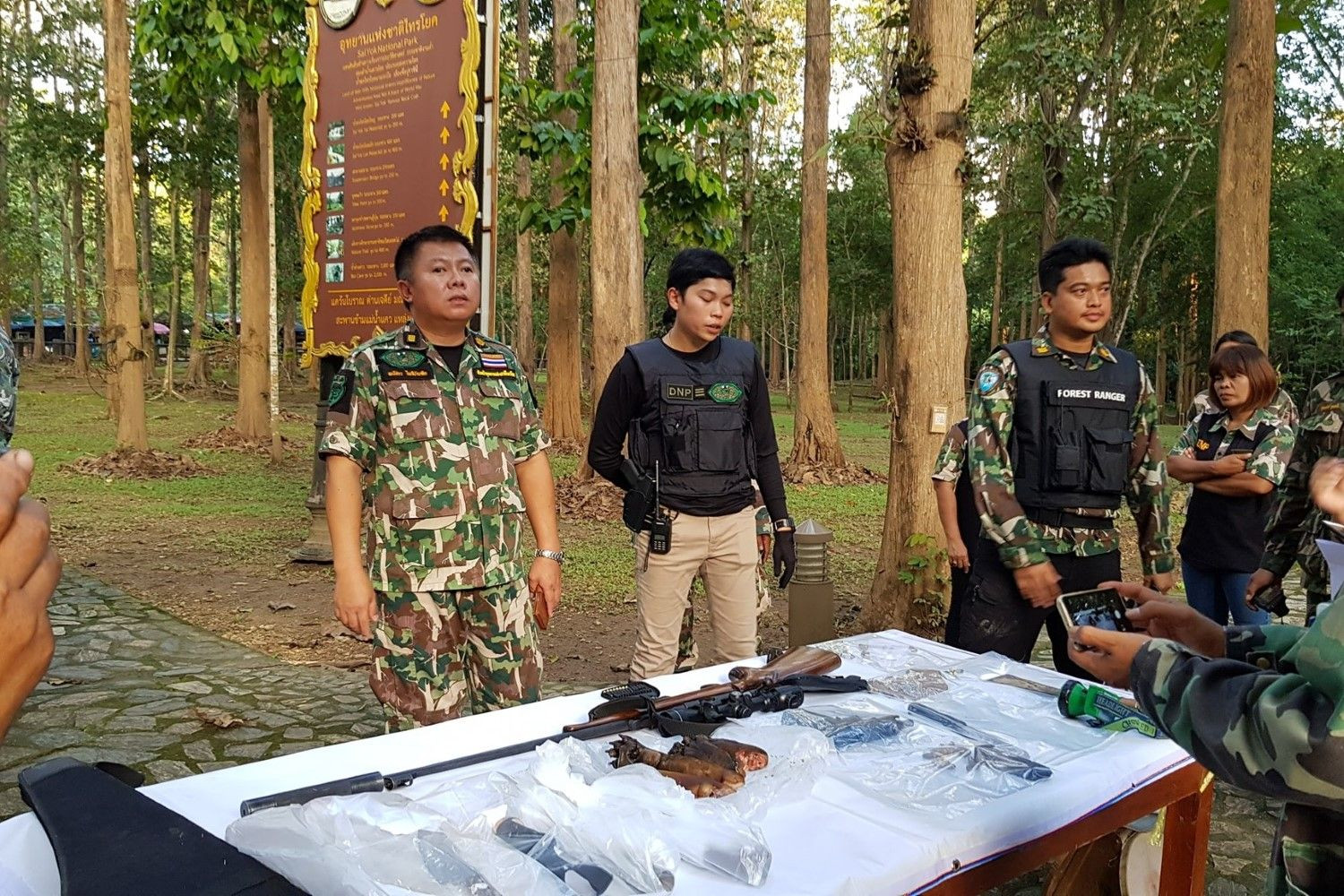 นายพนัชกร โพธิบัณฑิต หัวหน้าอุทยานแห่งชาติไทรโยค จ.กาญจนบุรี รักษาการหัวหน้าชุดเฉพาะกิจพญาเสือ กล่าวว่า ซากสัตว์ป่าที่พบเป็น หมีขอ โดยเหลือเพียงแค่อุ้งตีน 4 ข้าง ส่วนเนื้อคาดว่าจะมีประกอบอาหารกินหมดแล้ว ซึ่งหลังจากนี้จะรายงานให้อธิบดีกรมกรมอุทยานแห่งชาติสัตว์ป่าและพันธุ์พืชตามขั้นตอน