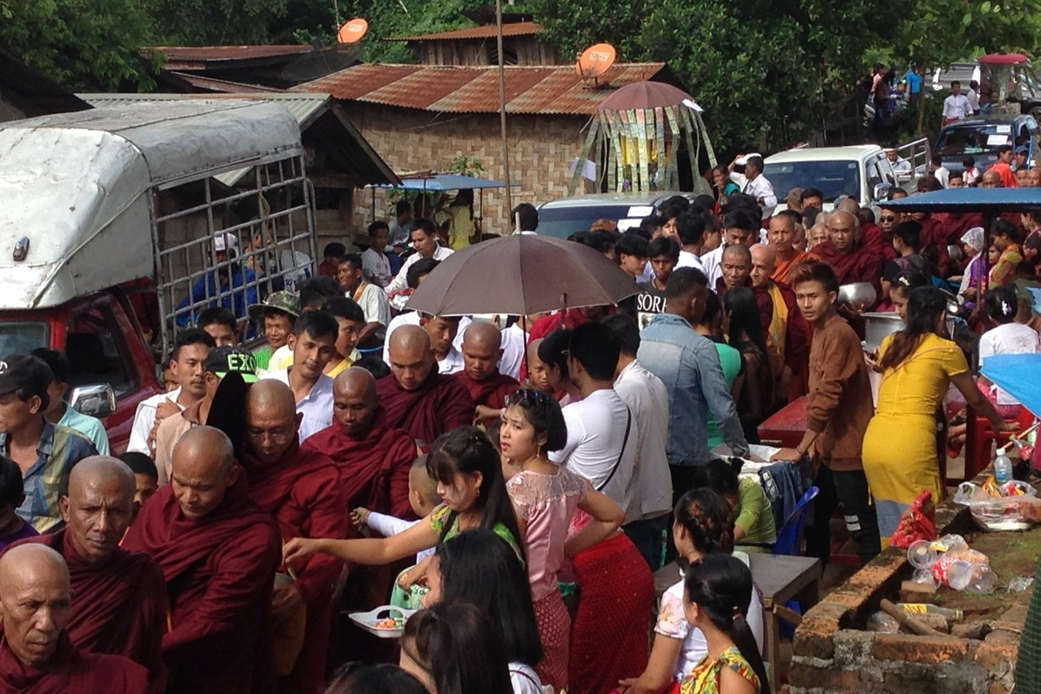 กาญจนบุรี-ชาวไทยและนักท่องเที่ยวด่านเจดีย์สามองค์ข้ามฝั่งไปเมียนมาร่วมประเพณีทำบุญตักบาตรเทโวที่อ.พญาตองซู
