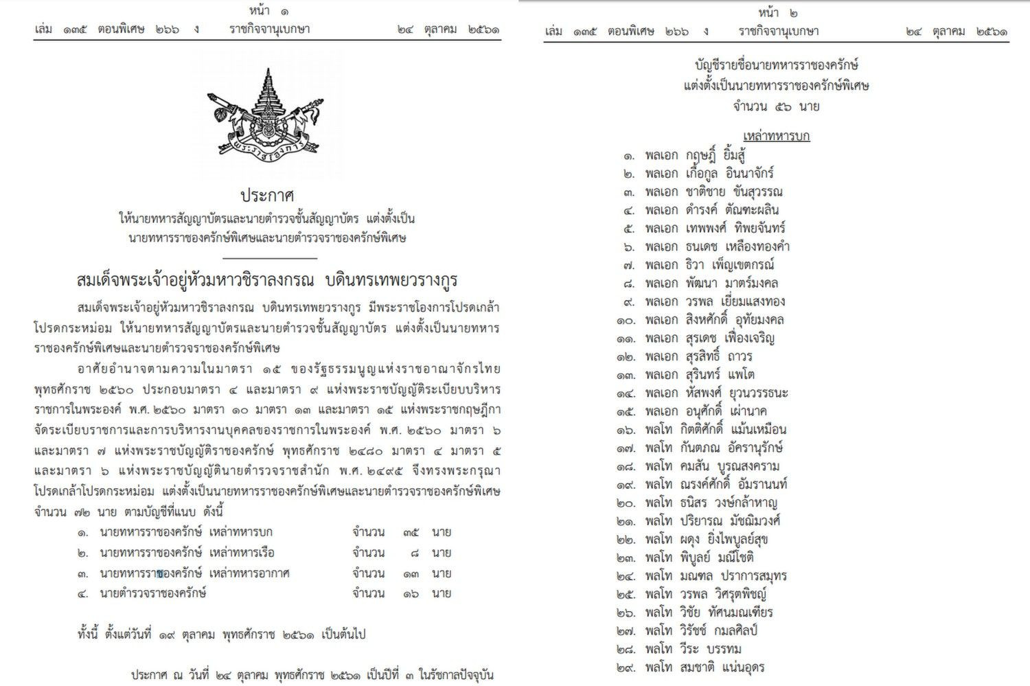 ราชกิจจานุเบกษาได้เผยแพร่ ประกาศ ให้นายทหารสัญญาบัตรและนายตำรวจชั้นสัญญาบัตร แต่งตั้งเป็นนายทหารราชองครักษ์พิเศษและนายตำรวจราชองครักษ์พิเศษ โดยมีใจความสำคัญว่า สมเด็จพระเจ้าอยู่หัวมหาวชิราลงกรณ บดินทรเทพยวรางกูร มีพระราชโองการโปรดเกล้าโปรดกระหม่อม ให้นายทหารสัญญาบัตรและนายตำรวจชั้นสัญญาบัตร แต่งตั้งเป็นนายทหารราชองครักษ์พิเศษและนายตำรวจราชองครักษ์พิเศษ จำนวน 72 นาย ดังนี้