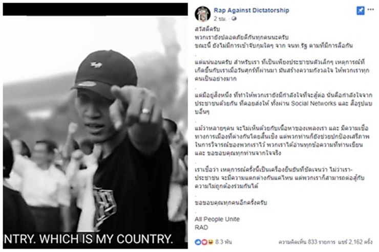 ด้าน เฟซบุ๊ก Rap Against Dictatorship เจ้าของเพลง ประเทศกูมี โพสต์ข้อความยืนยันว่า "สวัสดีครับ พวกเรายังปลอดภัยดีกันทุกคนนะครับ ขณะนี้ ยังไม่มีการเข้าจับกุมใดๆ จาก จนท.รัฐ ตามที่มีการลือกัน แต่แน่นอนครับ สำหรับเรา ที่เป็นเพียงประชาชนตัวเล็กๆ เหตุการณ์ที่เกิดขึ้นกับเราเมื่อวันศุกร์ที่ผ่านมา มันสร้างความกังวลใจ ให้พวกเราทุกคนเป็นอย่างมาก แต่มีอยู่สิ่งหนึ่ง ที่ทำให้พวกเรายังมีกำลังใจที่จะสู้ต่อ นั่นคือกำลังใจจาก ประชาชนด้วยกัน ที่คอยส่งให้ ทั้งผ่าน Social Networks และ สื่อรูปแบบอื่นๆ แม้ว่าหลายๆคน จะไม่เห็นด้วยกับเนื้อหาของเพลงเรา และ มีความเชื่อทางการเมืองที่ต่างกันโดยสิ้นเชิง แต่พวกท่านก็ยังช่วยปกป้องเสรีภาพในการวิจารณ์ของพวกเราไว้ พวกเราได้อ่านทุกข้อความที่ท่านเขียน และ ขอขอบคุณทุกท่านจากใจจริง เราเชื่อว่า เหตุการณ์ครั้งนี้เป็นเครื่องยืนยันที่ชัดเจนว่า ไม่ว่าเรา-ประชาชน จะมีความแตกต่างกันแค่ไหน แต่พวกเราก็สามารถต่อสู้กับความไม่ถูกต้องร่วมกันได้ ขอขอบคุณทุกคนอีกครั้งครับ"