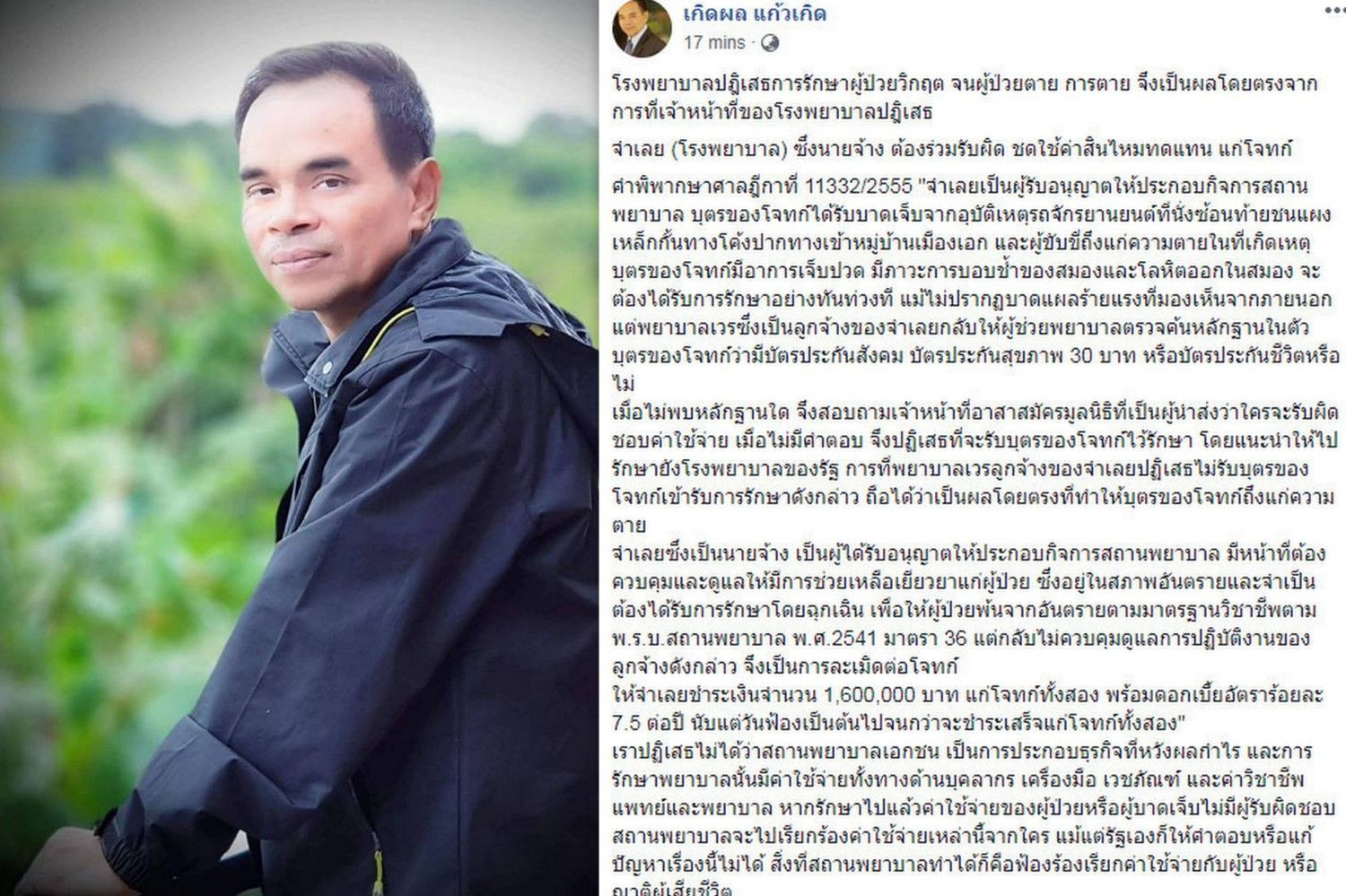 ทนายเกิดผลเผยคำพิพากษาศาลฎีกาชี้ โรงพยาบาลปฏิเสธการรักษาผู้ป่วยวิกฤตจนผู้ป่วยตายต้องร่วมรับผิด ชดใช้ค่าสินไหม