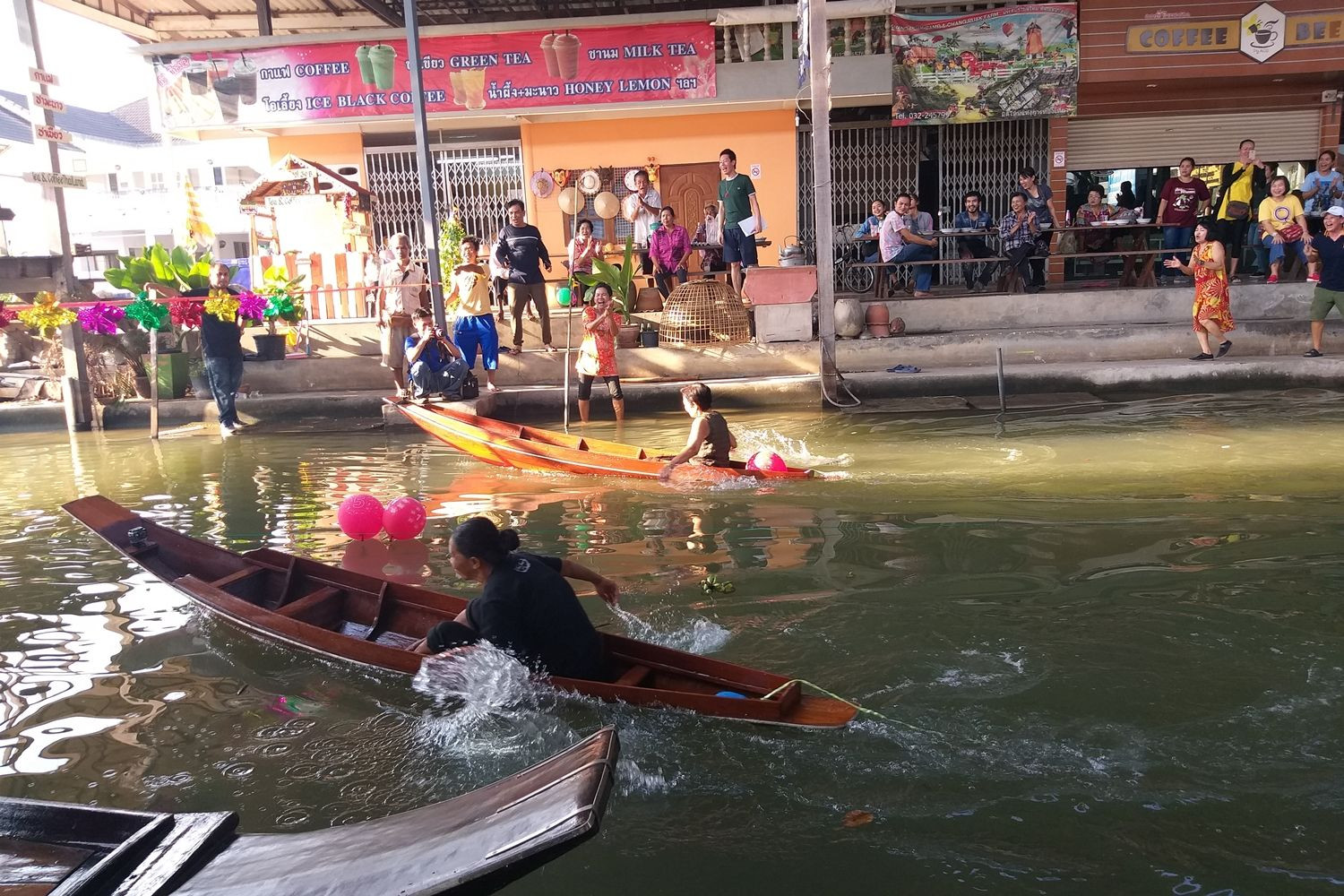 ผู้ค้าตลาดน้ำดำเนินสะดวกฉลองปีใหม่แข่งพายเรือด้วยมือ