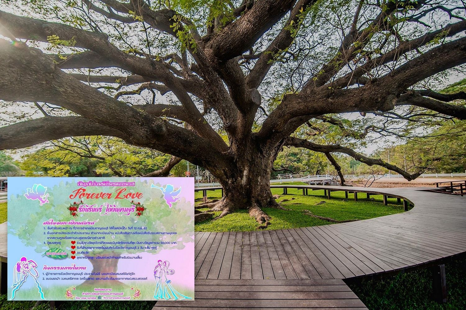 กาญจนบุรี-นายอำเภอเมืองกาญจน์จัดงาน" Forever Love "ชวนคู่รัก จดทะเบียนสมรสใต้ต้นจามจุรียักษ์ ถือเคล็ดเพื่อให้ชีวิตรักยืนยาว